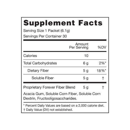 مصرف روزانه 30 گرم فیبر برای بهبود عملکرد دستگاه گوارش مفید می باشد. فیبر فوراور شامل 4 نوع فیبر است که با افزودن آن به رژیم غذایی، نیاز کلی بدن به فیبر را تامین می نماید. یکی از ویژگی های خاص این مکمل ایجاد احساس سیری می باشد؛ این خاصیت برای افرادی که در رژیم کاهش وزن و کنترل کالری هستند بسیار حائز اهمیت می باشد. هر ساشه فیبر فوراور معادل مصرف 2 قطعه نان تست گندم بدون کربوهیدرات و کالری می باشد.